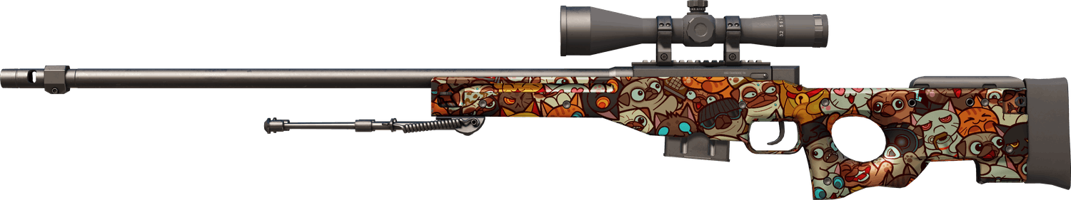 The AWP PAW pattern is taken from a sheet that has a colorful drawing of 50 different cats and dogs in varying poses, which is transferred on the AWP’s body with its scope, barrel, and recoil pad remaining unpainted. The position of the pattern is determined by changes in the X and Y axis parameters when it’s transferred onto the AWP, resulting in each skin having one of a thousand different pattern variations. Some characters in the PAW pattern stand out from others and are popularly considered to be easter eggs, these being the Gold Cat, Gold Grenade, Gas Mask, Gold Cat Knife, and Stoner Cat.