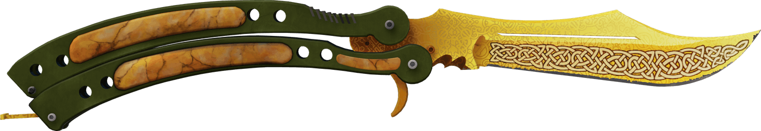 The Lore finish for the Butterfly Knife is another beautifully crafted design that is one of the most popular finishes within the CS2 community. In Factory New condition, the price of the knife is slightly lower than the top contender and takes the second spot on this list. The blade is a light gold color and has an intricate knotted pattern carved on it which seems inspired by ancient Nordic art. The handle is an army green metallic, with grips that seem to have a dull gold marble finish on them.