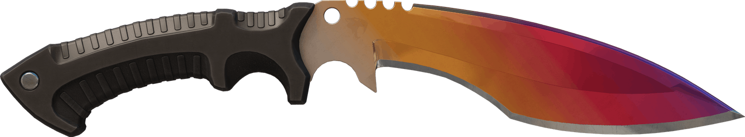 As with all knives that come in the Fade finish, the Kukri also has float values ranging only from 0.00 (Factory New) to 0.08 (Minimal Wear). This results in the vast majority of Kukri Knife Fades unboxed to be Factory New, with only a few Minimal Wear ones. Float values for the most part have a negligible effect on the blade surface of knives in the Fade finish, and the Kukri is no exception. Even at the highest float value of 0.08, the blade shows no discernible abrasions or other marks. Despite this, the knife in Factory New condition remains slightly more expensive than in Minimal Wear.