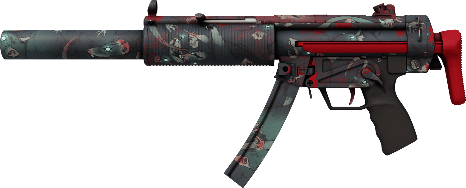 Similar to the Case Hardened finish, the MP5 Lab Rats patterns come from a pre-designed sheet which is transferred onto the weapon in a cookie cutter style. The transfer may deviate on the X-axis (Horizontally), Y-axis (Vertically), and it also has a possible rotation of 360 degrees, giving it 1000 different pattern variations. The Lab Rats design sheet has a drawing of a swarm of rats that covers the entire surface. The main colors are gray, with the snouts and paws of the rats being red, and eyes being blue. A large part of the center of the sheet is completely red, which makes the rats in this part stand out from the rest. On the top left is another single rat which is red with an angry expression on its face.