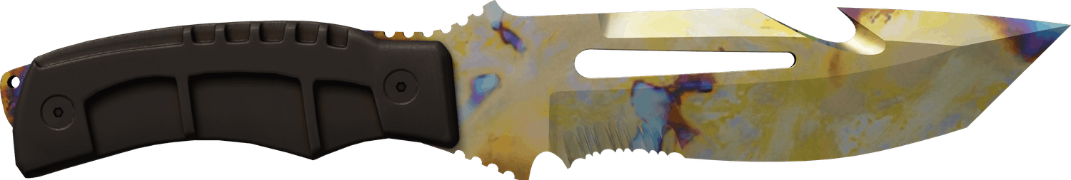 The Case Hardened pattern on the Survival Knife covers the entirety of the blade, while the black plastic handle remains as is. The float values for this knife range from 0.00 (Factory New) to 1.00 (Battle-Scarred), meaning that it is available in all wears, with a higher float value resulting in overall darker shades of colors.