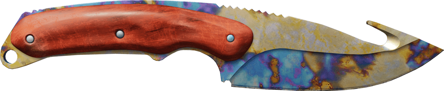 Next up, we have the Case Hardened Gut Knife featuring an almost rusted and discolored look that dominates most of the weapon. A lot of the damage can be seen all around the blade, with heavy discoloration all over. Rust eats up the rest of the parts, generating a look that’s beaten up, but also somewhat terrifying. Definitely a unique skin that certainly has its own appeal.