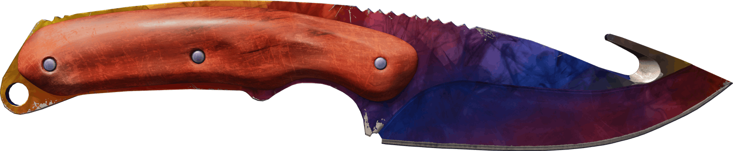 Moving on with the Gut Knife list, we have the ever-popular Marble Fade skin. Unlike the Fade skin, however, the Marble Fade Gut Knife has a surprisingly different design from most other skins of its type. Instead of the shifting reds, blues, and yellows, this time the knife goes for a dual-tone look, contrasting shifting red with shifting blues paired with a wooden handle. It’s an incredibly striking effect, one that’s a hit with players everywhere.