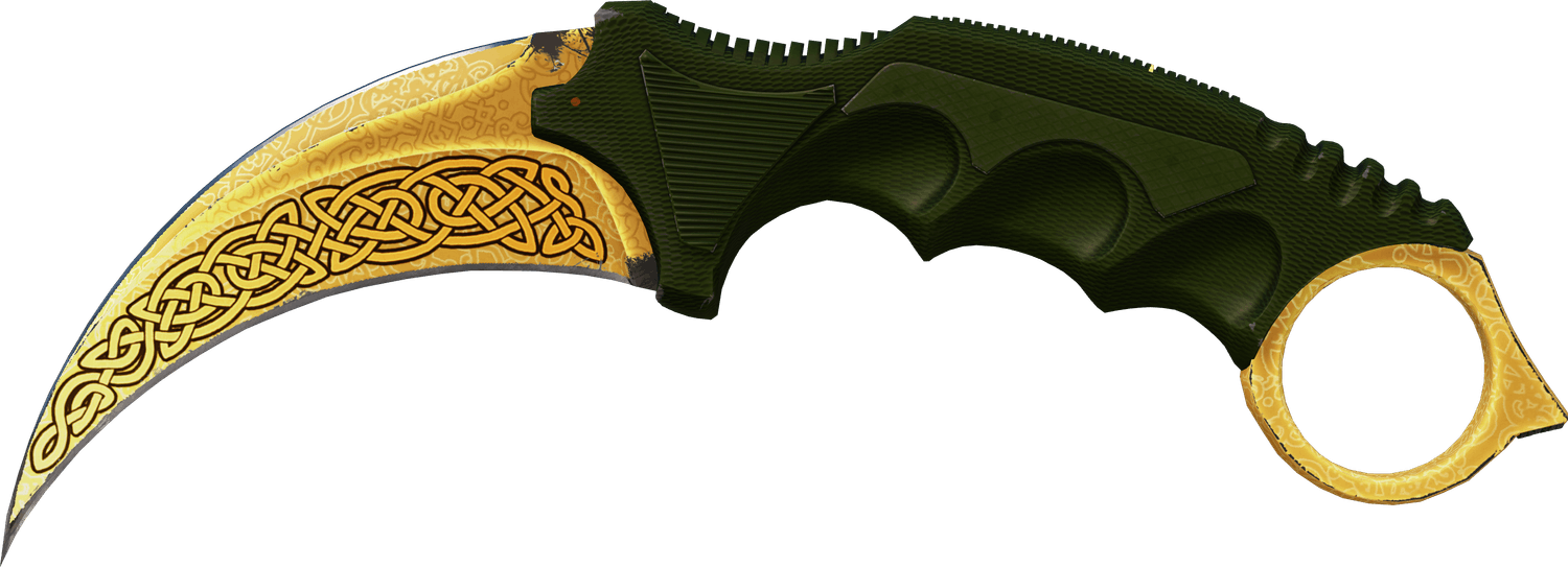 Next up, we have the Lore Karambit, an excellent example of a skin making the best use out of a knife’s shape and look. The detailed decal on the blade of the knife is extended to fit the entire curve, and it looks incredible. With a solid gold blade and a dark green handle, there’s also some nice contrast thrown into the mix that lets everything be easier on the eyes. An excellent skin, one of the best ones in our opinion.