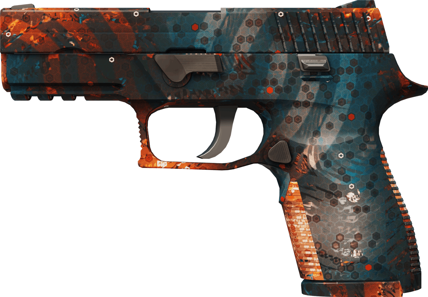 The legendady Asiimov finish is also available for the P250 and naturally, it makes it inside our top list! The beautiful pattern shines in its orange, white, and black hues.
