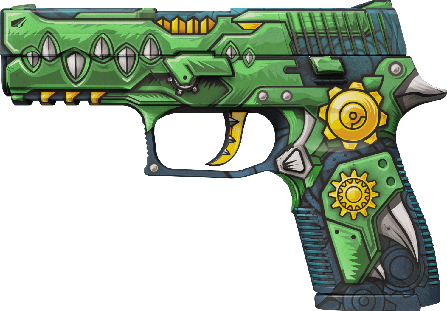 This P250 skin is in great condition, the “Minimal Wear” exterior looks more like it’s “Factory New”. It features an alligator design, hence its name - “see ya later, alligator”.