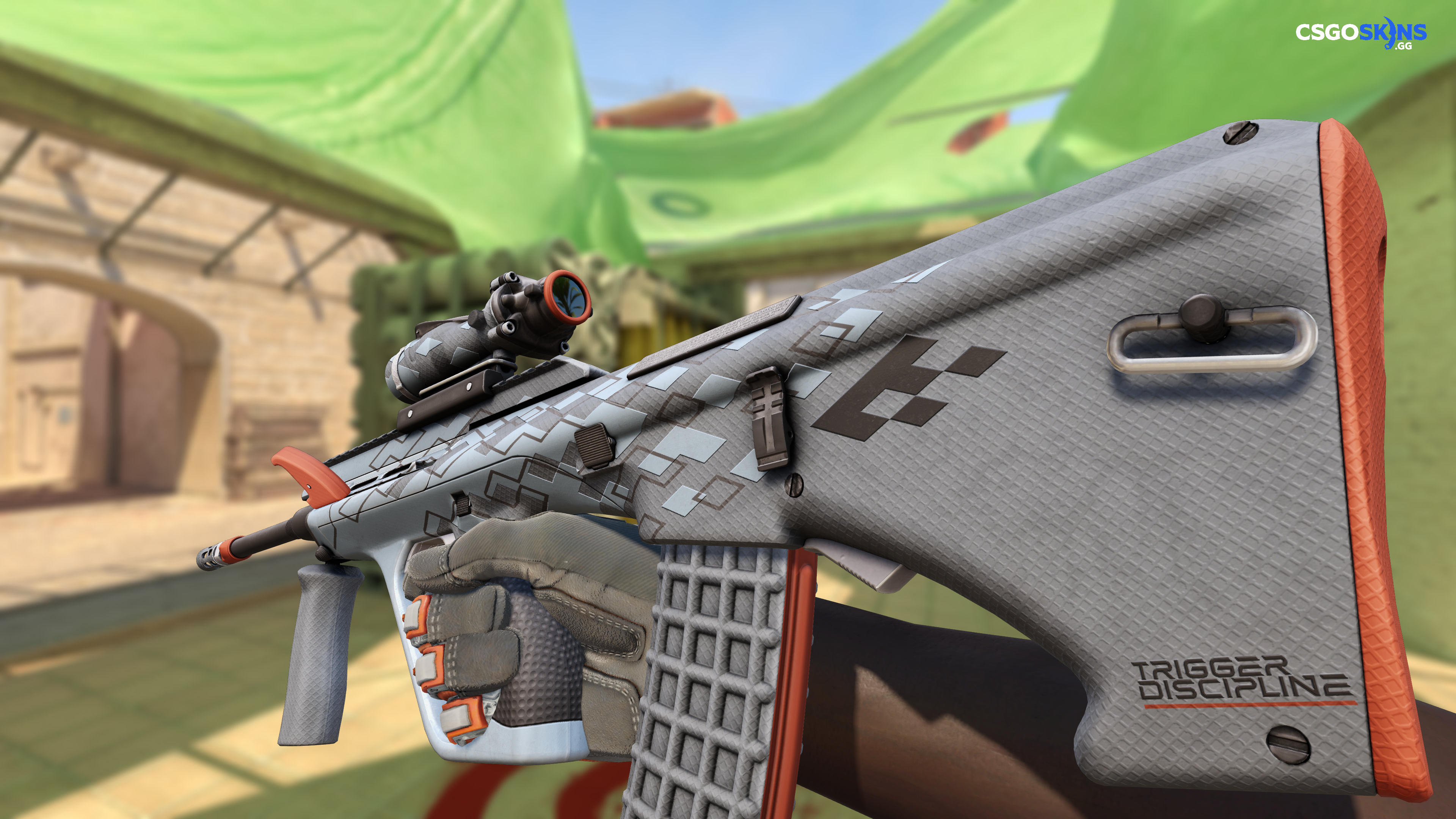 This AUG has been painted in a "Custom Paint Job" style, with the Trigger Discipline finish. This style enables extremely customized looks in a full range of colors. Different pattern indexes have no effect on the Trigger Discipline finish. The skin uses the new CS2 model.