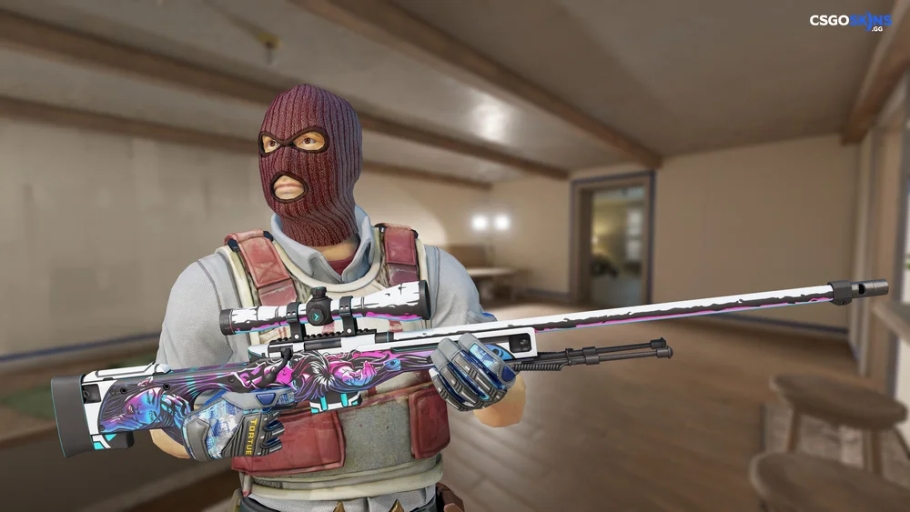 High risk and high reward, the infamous AWP is recognizable by its signature report and one-shot, one-kill policy. It has been custom painted with two stylized blue-magenta women over a grayscale background. "They took comfort in each other's despair"