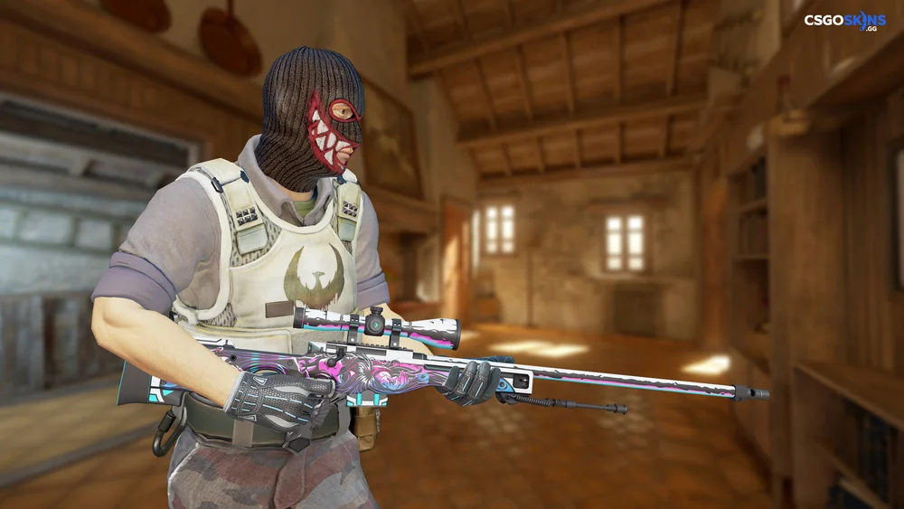 This AWP has been painted in a "Custom Paint Job" style, with the Neo-Noir finish. This style enables extremely customized looks in a full range of colors. The skin has been painted in a color scheme of blue, pink and white. Different pattern indexes have no effect on the Neo-Noir finish. The skin uses the old legacy model.