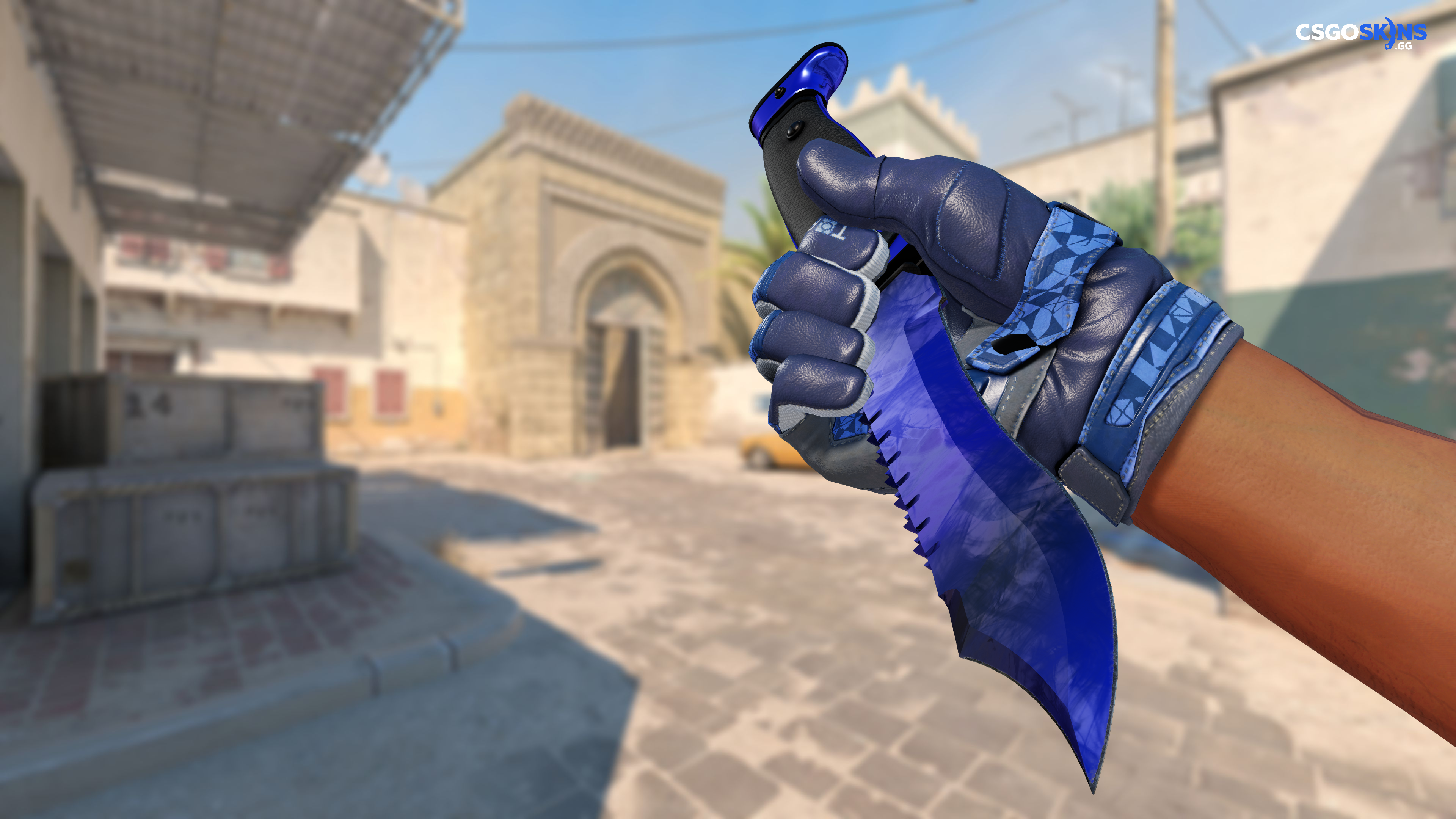 This Bowie Knife has been painted in a "Anodized Multicolored" style, with the Doppler Phase 4 finish. In this style, the candy coat may be applied in a multicolored pattern. In the real world, methods could include silk-screening or adherable stencils. The primary color of this skin is composed of a blue tint. The look of the Doppler Phase 4 finish is affected by its pattern index. The skin uses the new CS2 model.