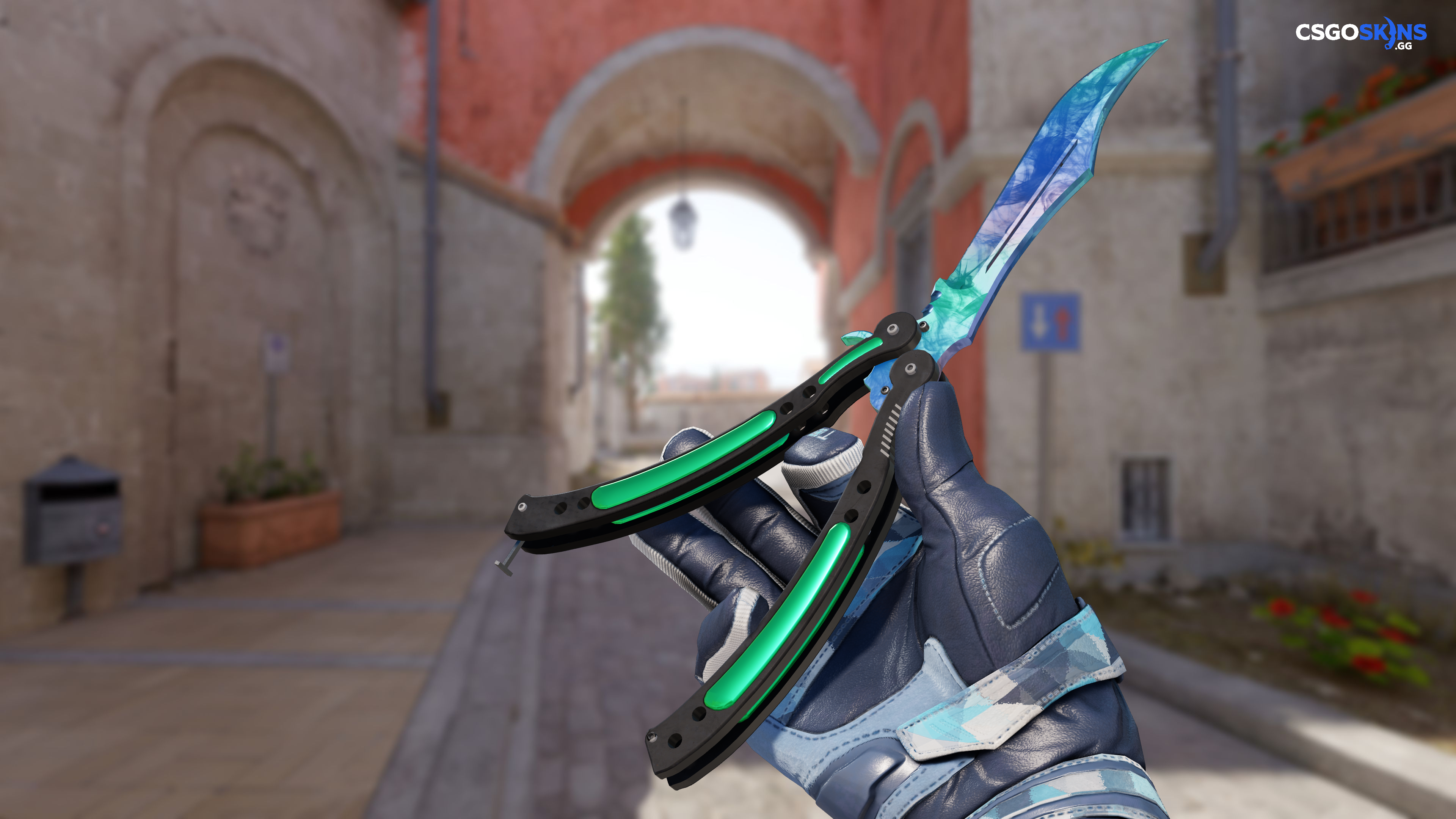 This Butterfly Knife has been painted in a "Anodized Multicolored" style, with the Gamma Doppler Phase 1 finish. In this style, the candy coat may be applied in a multicolored pattern. In the real world, methods could include silk-screening or adherable stencils. The skin has been painted in a color scheme of blue and cyan. The look of the Gamma Doppler Phase 1 finish is affected by its pattern index. The skin uses the new CS2 model.