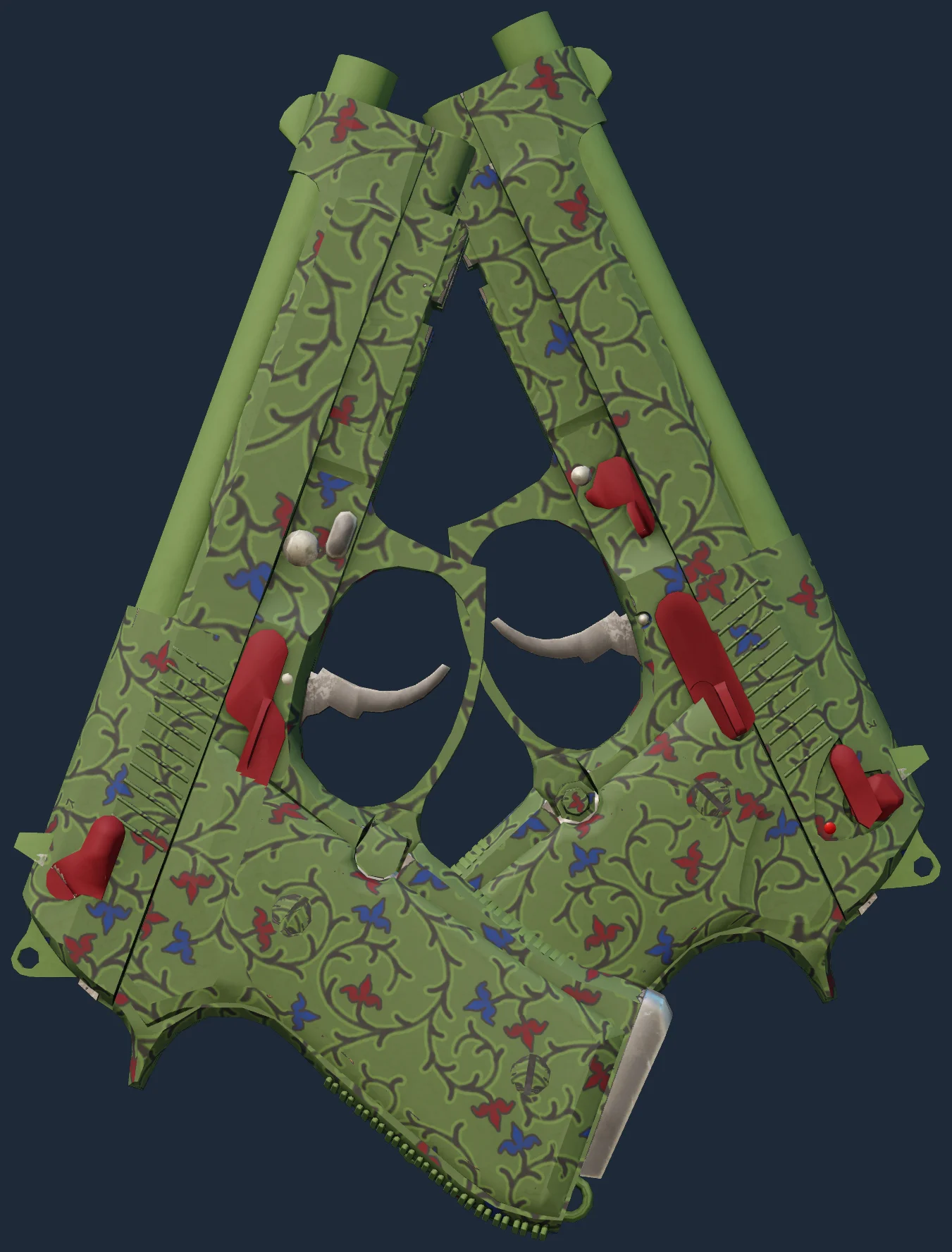 This Dual Berettas has been painted in a "Hydrographic" style, with the Briar finish. Disassembled weapon parts are lowered through a floating hydrographic film on the surface of a water tank. The film adheres to the primed weapon parts, covering the surface with a pattern. The primary color of this skin is composed of a green tint. Different pattern indexes have no effect on the Briar finish. The skin uses the old legacy model.