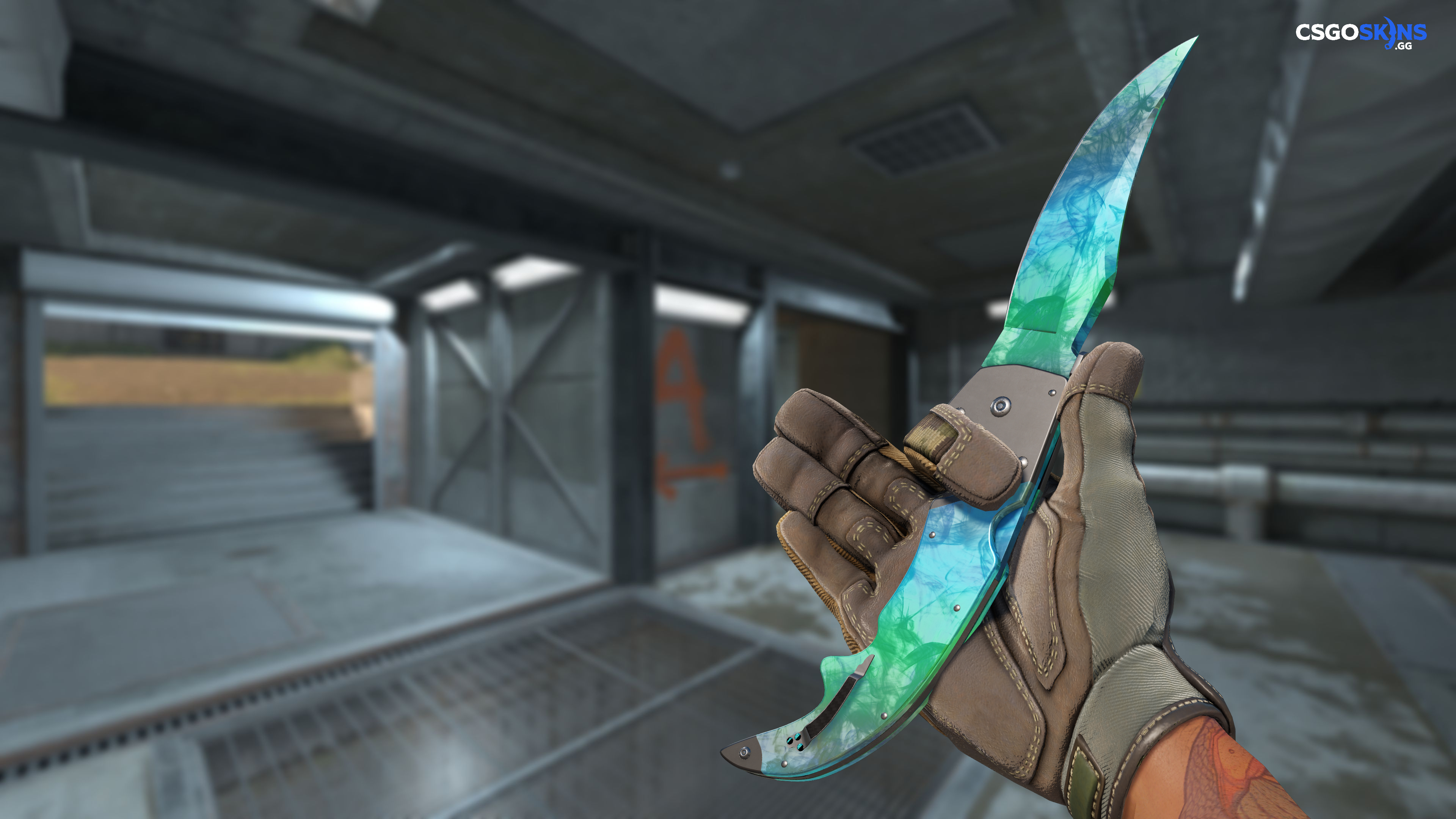 This Falchion Knife has been painted in a "Anodized Multicolored" style, with the Gamma Doppler Phase 3 finish. In this style, the candy coat may be applied in a multicolored pattern. In the real world, methods could include silk-screening or adherable stencils. The primary color of this skin is composed of a green tint. The look of the Gamma Doppler Phase 3 finish is affected by its pattern index. The skin uses the new CS2 model.
