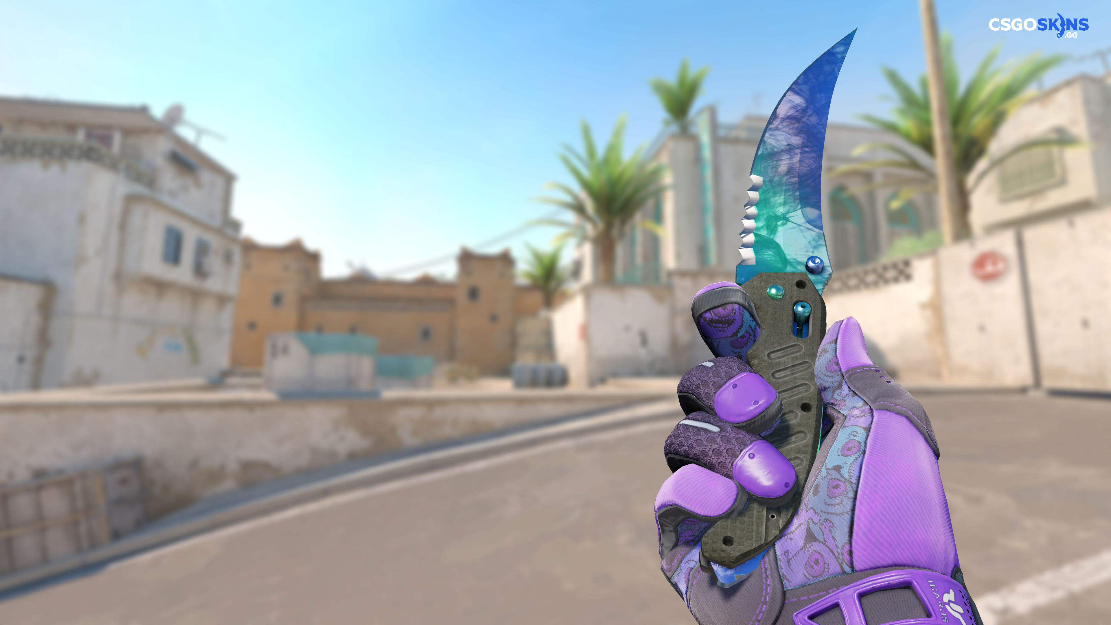 This Flip Knife has been painted in a "Anodized Multicolored" style, with the Gamma Doppler Phase 1 finish. In this style, the candy coat may be applied in a multicolored pattern. In the real world, methods could include silk-screening or adherable stencils. The skin has been painted in a color scheme of blue and cyan. The look of the Gamma Doppler Phase 1 finish is affected by its pattern index. The skin uses the new CS2 model.