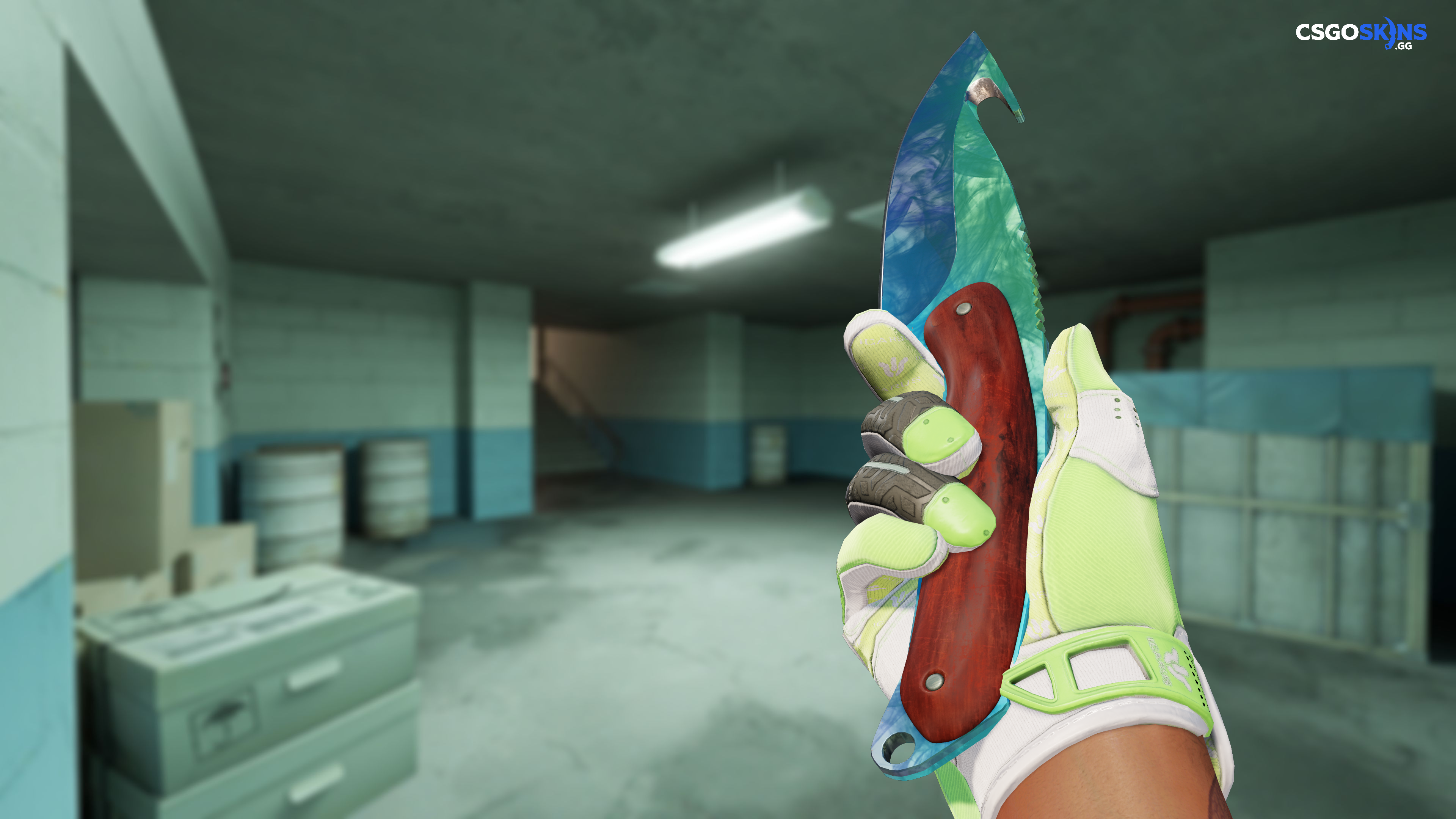 This Gut Knife has been painted in a "Anodized Multicolored" style, with the Gamma Doppler Phase 4 finish. In this style, the candy coat may be applied in a multicolored pattern. In the real world, methods could include silk-screening or adherable stencils. The primary color of this skin is composed of a green tint. The look of the Gamma Doppler Phase 4 finish is affected by its pattern index. The skin uses the new CS2 model.