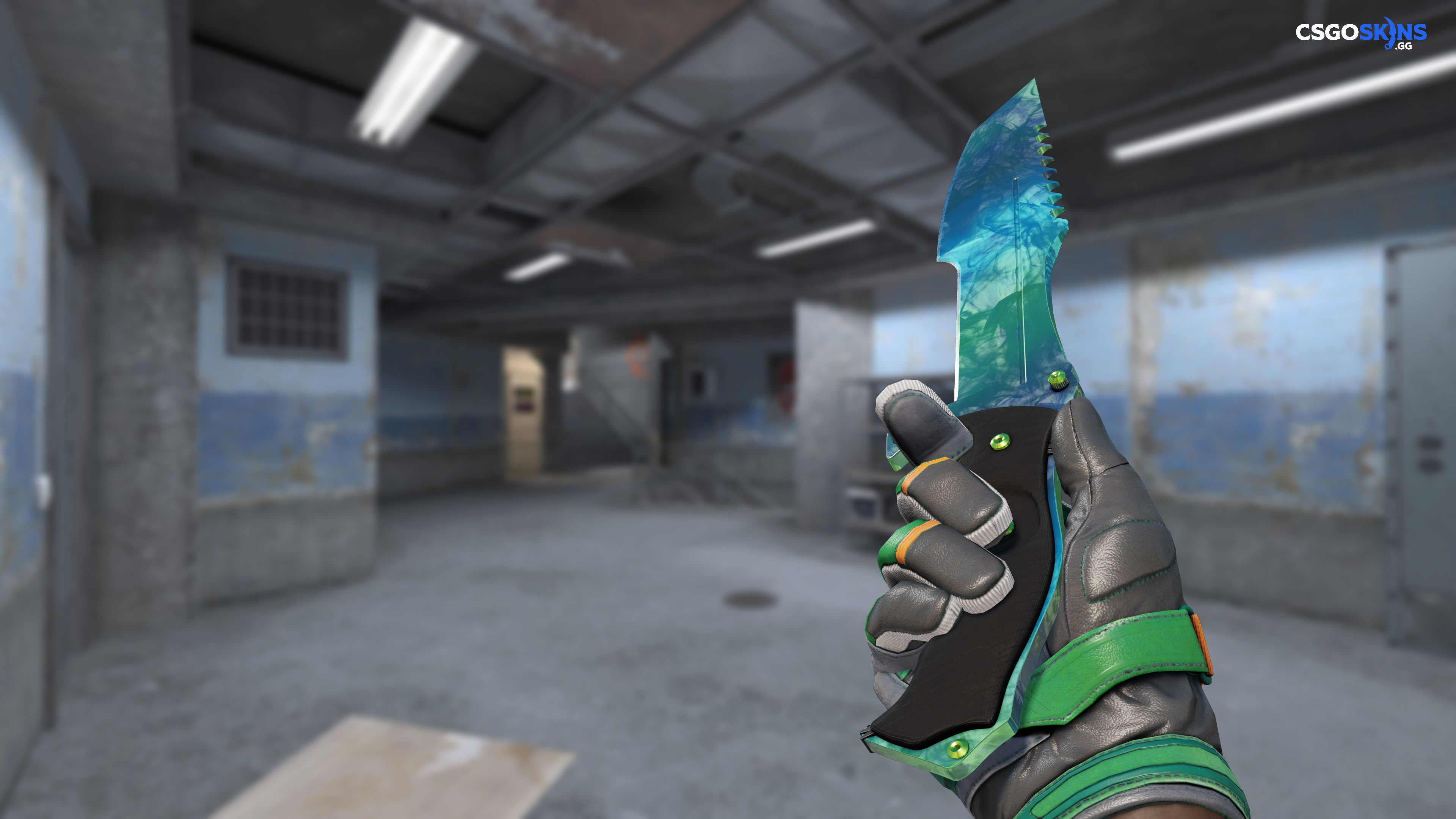 This Huntsman Knife has been painted in a "Anodized Multicolored" style, with the Gamma Doppler Phase 4 finish. In this style, the candy coat may be applied in a multicolored pattern. In the real world, methods could include silk-screening or adherable stencils. The primary color of this skin is composed of a green tint. The look of the Gamma Doppler Phase 4 finish is affected by its pattern index. The skin uses the new CS2 model.
