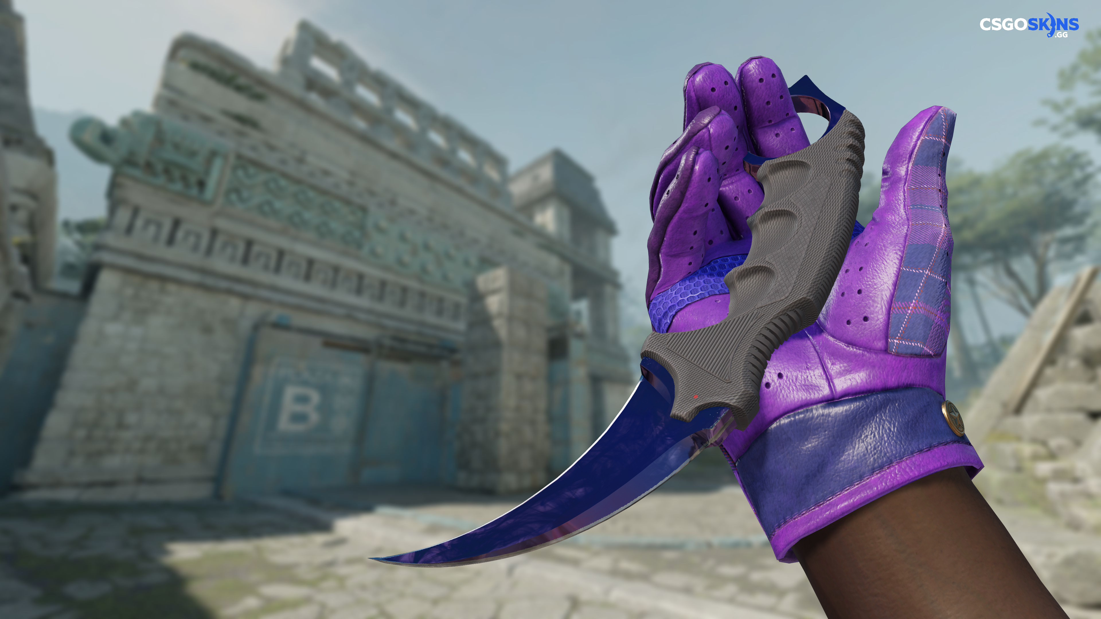 This Karambit has been painted in a "Anodized Multicolored" style, with the Doppler Black Pearl finish. In this style, the candy coat may be applied in a multicolored pattern. In the real world, methods could include silk-screening or adherable stencils. The primary color of this skin is composed of a purple tint. The look of the Doppler Black Pearl finish is affected by its pattern index. The skin uses the new CS2 model.