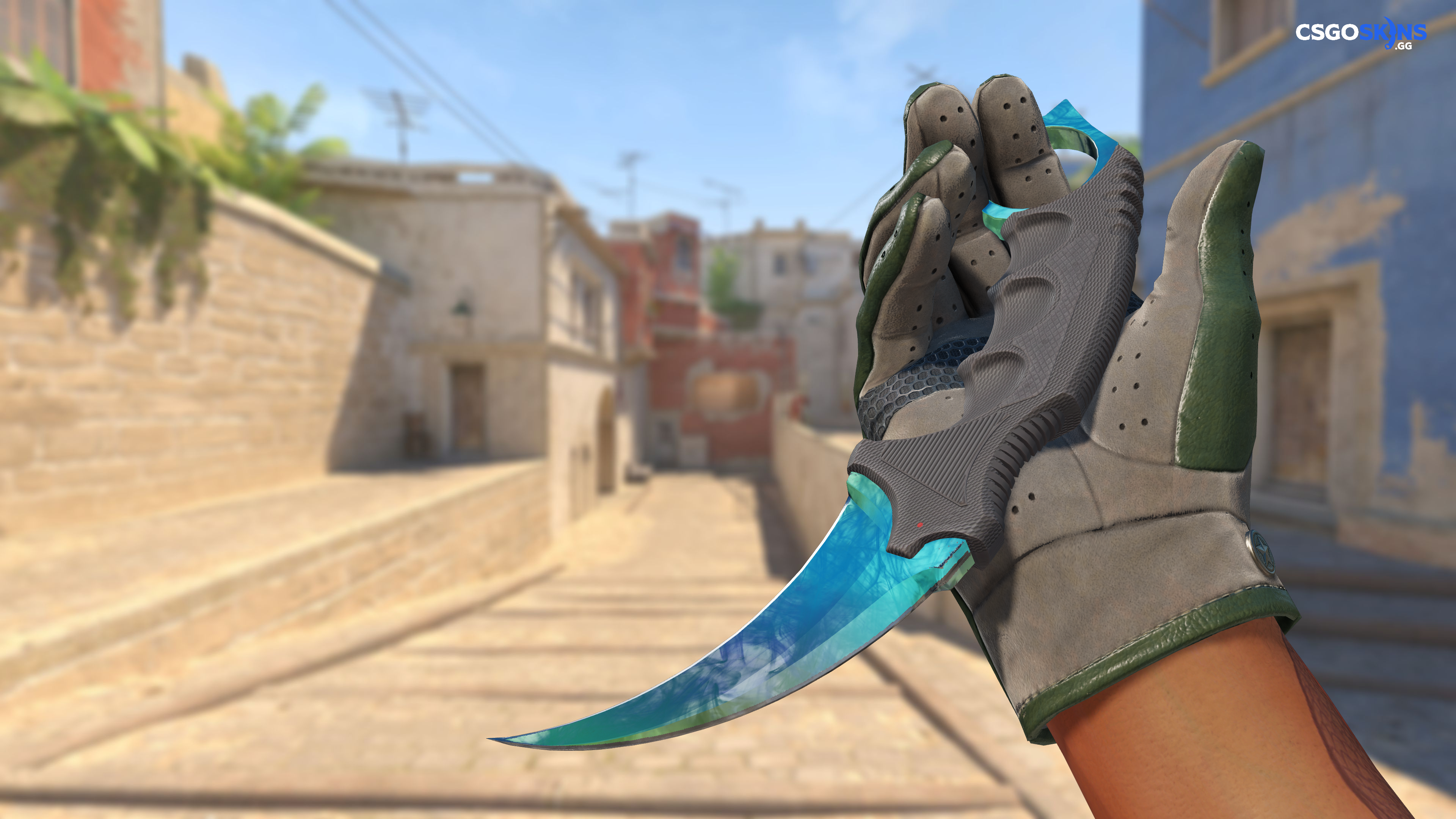 This Karambit has been painted in a "Anodized Multicolored" style, with the Gamma Doppler Phase 4 finish. In this style, the candy coat may be applied in a multicolored pattern. In the real world, methods could include silk-screening or adherable stencils. The primary color of this skin is composed of a green tint. The look of the Gamma Doppler Phase 4 finish is affected by its pattern index. The skin uses the new CS2 model.