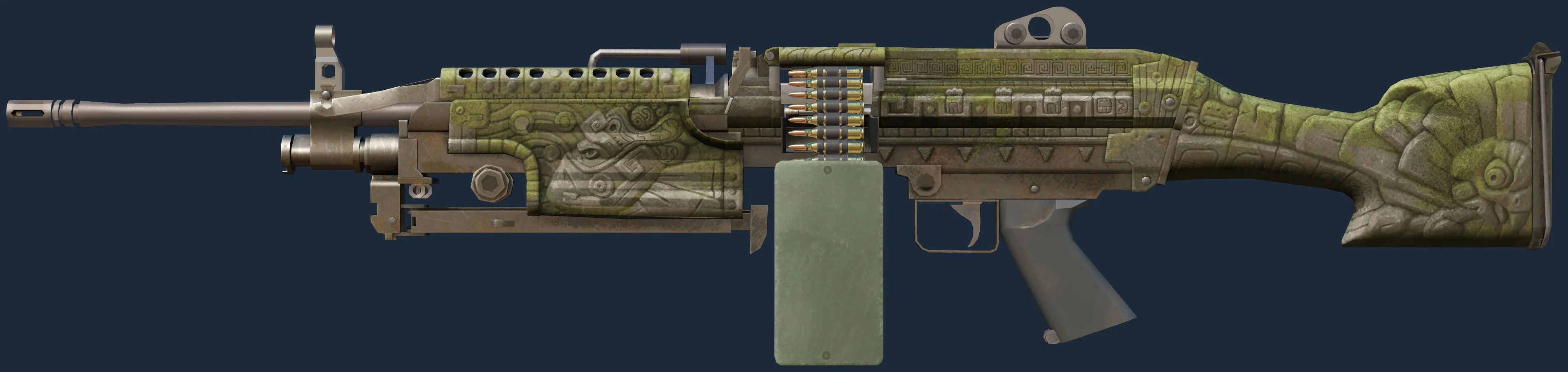 This M249 has been painted in a "Patina" style, with the Aztec finish. A patina is a chemical reaction that forms a non-reactive, hardened shell over metallic parts. Real-life weapon patinas include case hardening, cold bluing, and acid forced patinas. The primary color of this skin is composed of a green tint. Different pattern indexes have no effect on the Aztec finish. The skin uses the old legacy model.