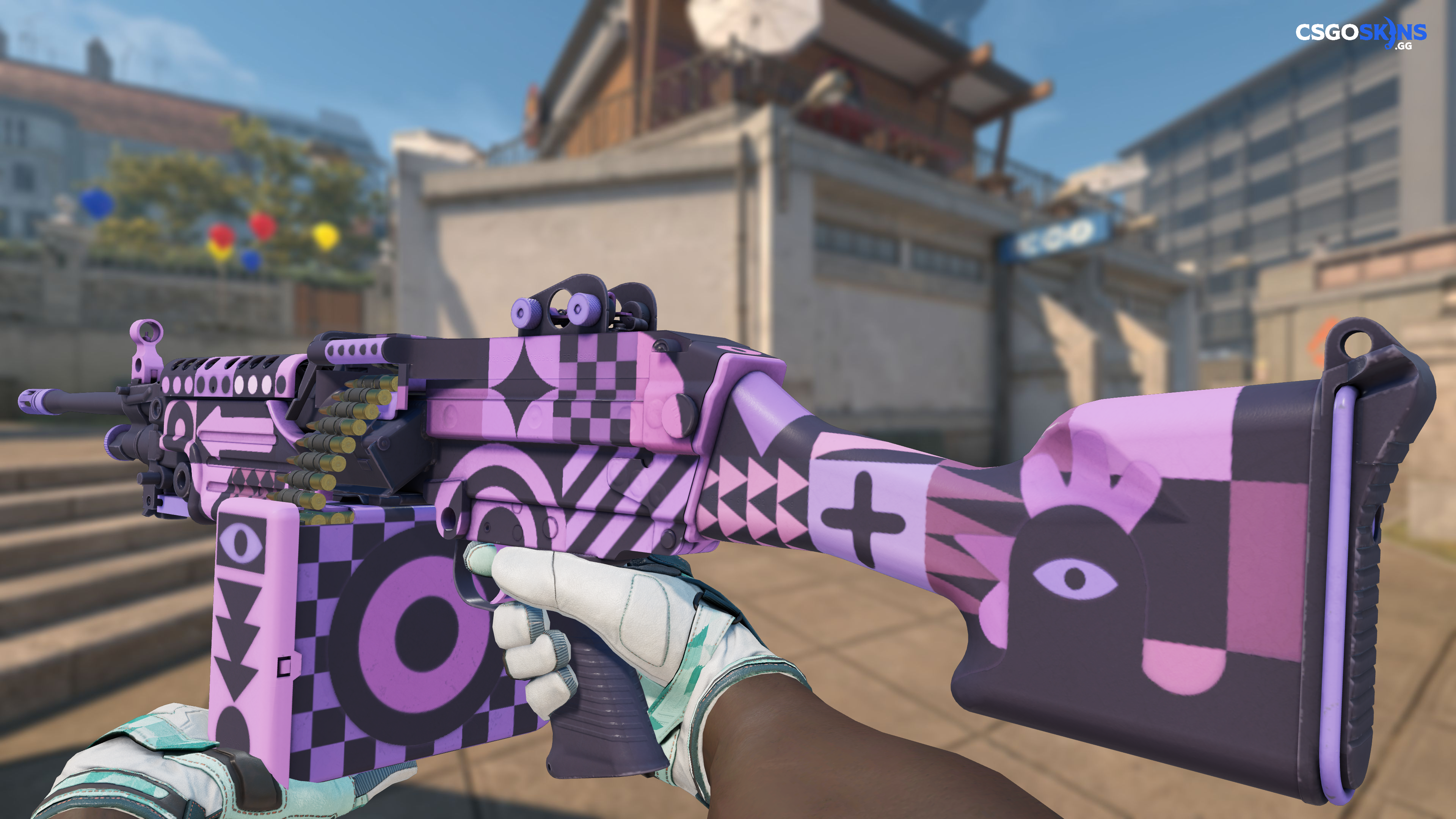 This M249 has been painted in a "Custom Paint Job" style, with the Bock Blocks finish. This style enables extremely customized looks in a full range of colors. The skin has been painted in a color scheme of purple and pink. Different pattern indexes have no effect on the Bock Blocks finish. The skin uses the new CS2 model.