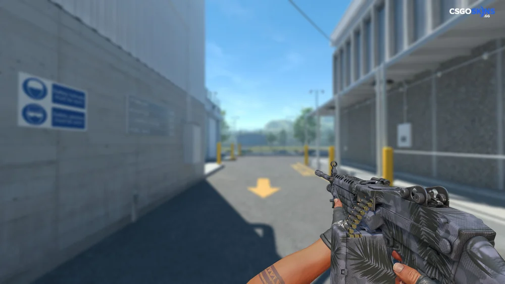 This M249 has been painted in a "Spray-Paint" style, with the Midnight Palm finish. The weapon is spray-painted with multiple coats through stencil patterns. That said, this particular skin has been mostly painted in shades of black. The look of the Midnight Palm finish is affected by its pattern index. The skin uses the new CS2 model.
