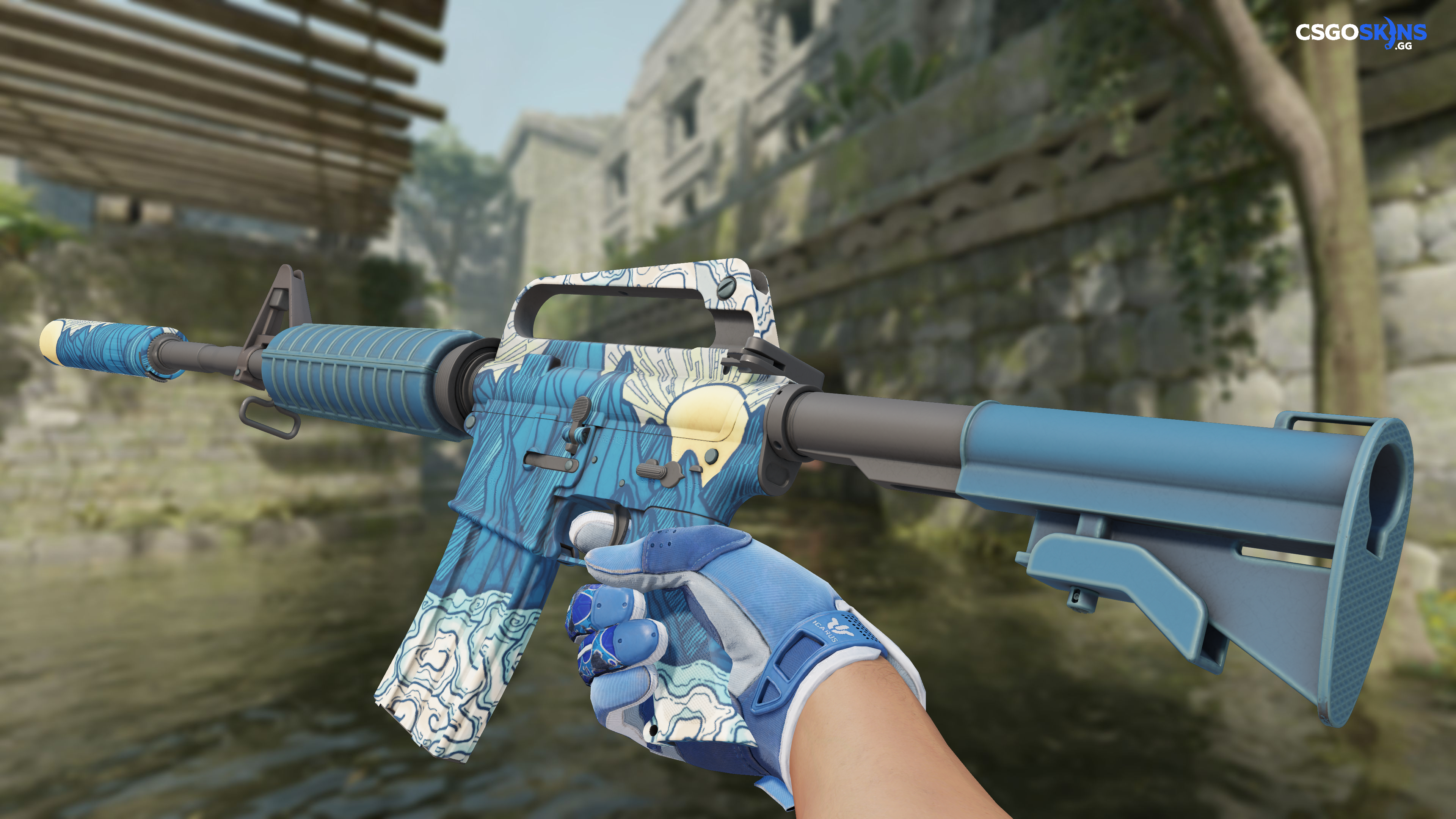 This M4A1-S has been painted in a "Hydrographic" style, with the Solitude finish. Disassembled weapon parts are lowered through a floating hydrographic film on the surface of a water tank. The film adheres to the primed weapon parts, covering the surface with a pattern. The primary color of this skin is composed of a blue tint. The look of the Solitude finish is affected by its pattern index. The skin uses the new CS2 model.