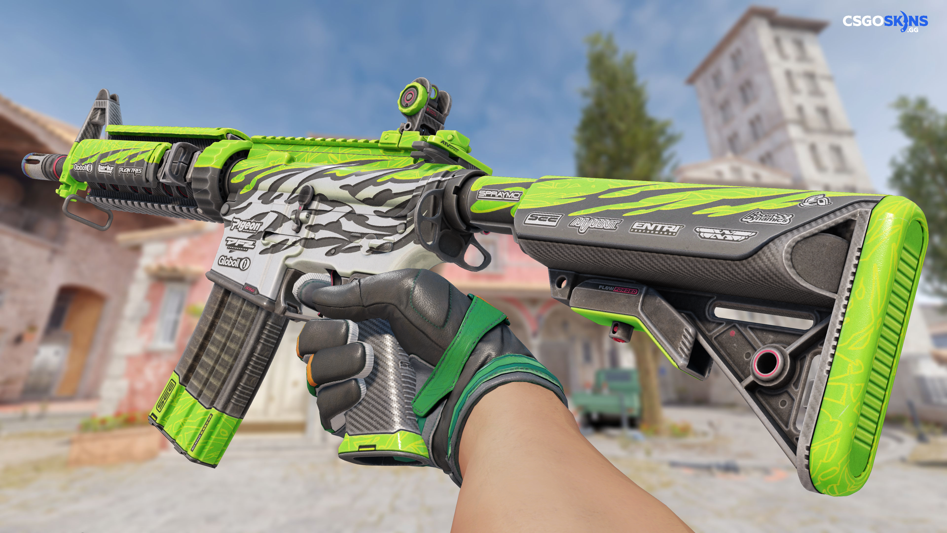 More accurate but less damaging than its AK-47 counterpart, the M4A4 is the full-auto assault rifle of choice for CTs. It has been custom painted with a neon green base and finished with fictitious logos meant to evoke drift and tuning culture. Where "Globoil 1 Synthetics" meets "ENTRI PERFORMANCE"