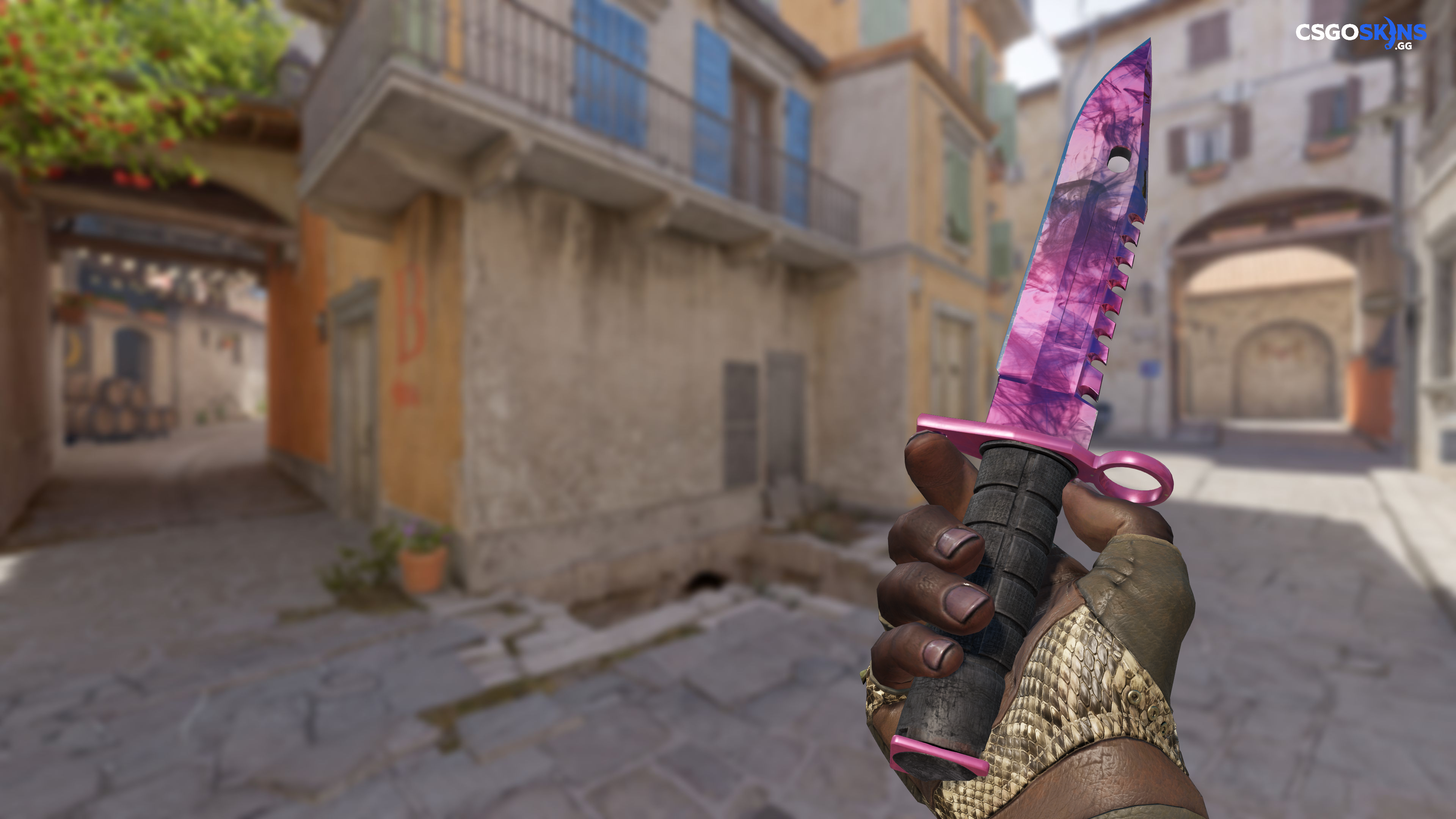 This M9 Bayonet has been painted in a "Anodized Multicolored" style, with the Doppler Phase 2 finish. In this style, the candy coat may be applied in a multicolored pattern. In the real world, methods could include silk-screening or adherable stencils. The primary color of this skin is composed of a pink tint. The look of the Doppler Phase 2 finish is affected by its pattern index. The skin uses the new CS2 model.