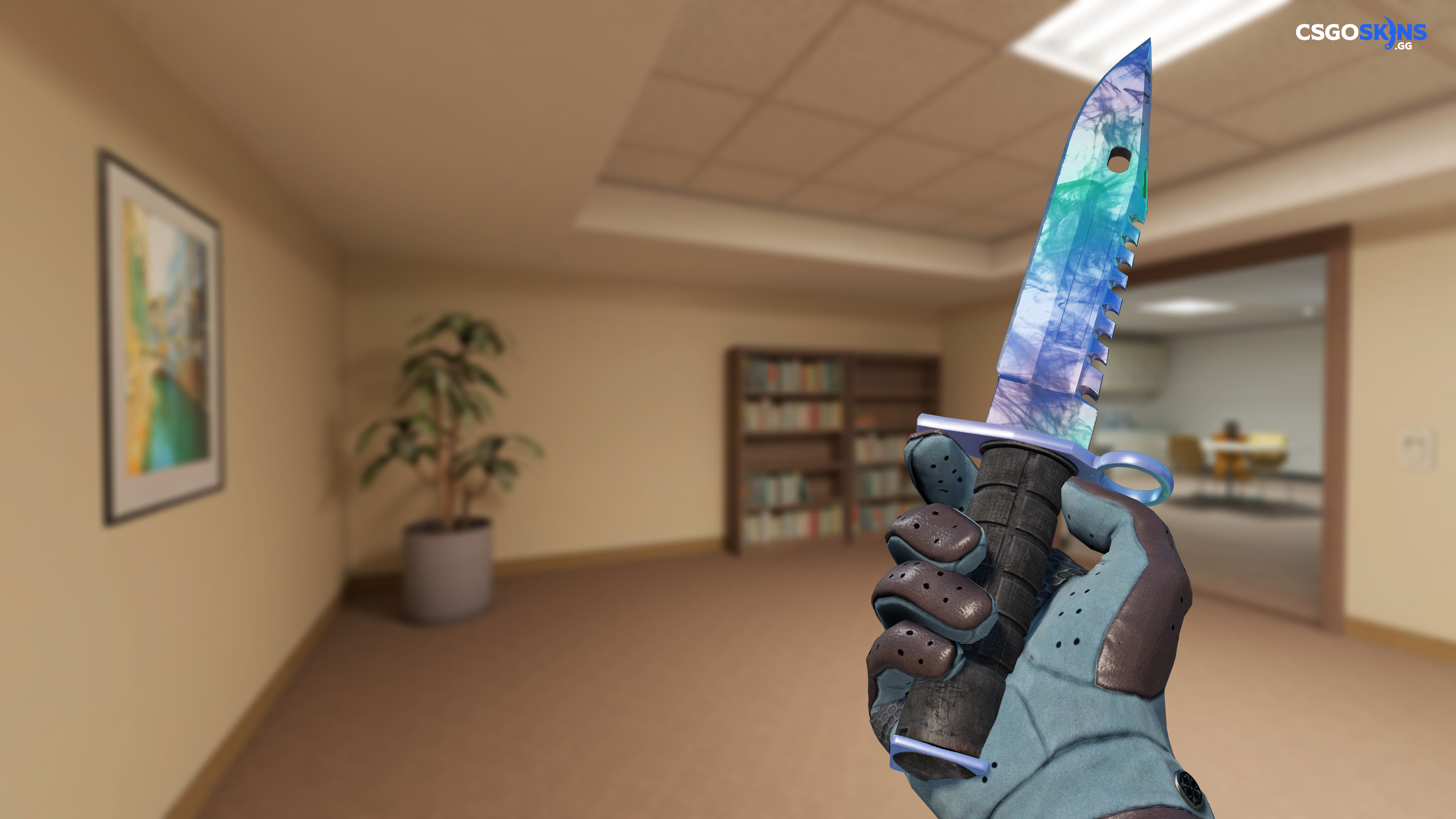 This M9 Bayonet has been painted in a "Anodized Multicolored" style, with the Gamma Doppler Phase 1 finish. In this style, the candy coat may be applied in a multicolored pattern. In the real world, methods could include silk-screening or adherable stencils. The skin has been painted in a color scheme of blue and cyan. The look of the Gamma Doppler Phase 1 finish is affected by its pattern index. The skin uses the new CS2 model.