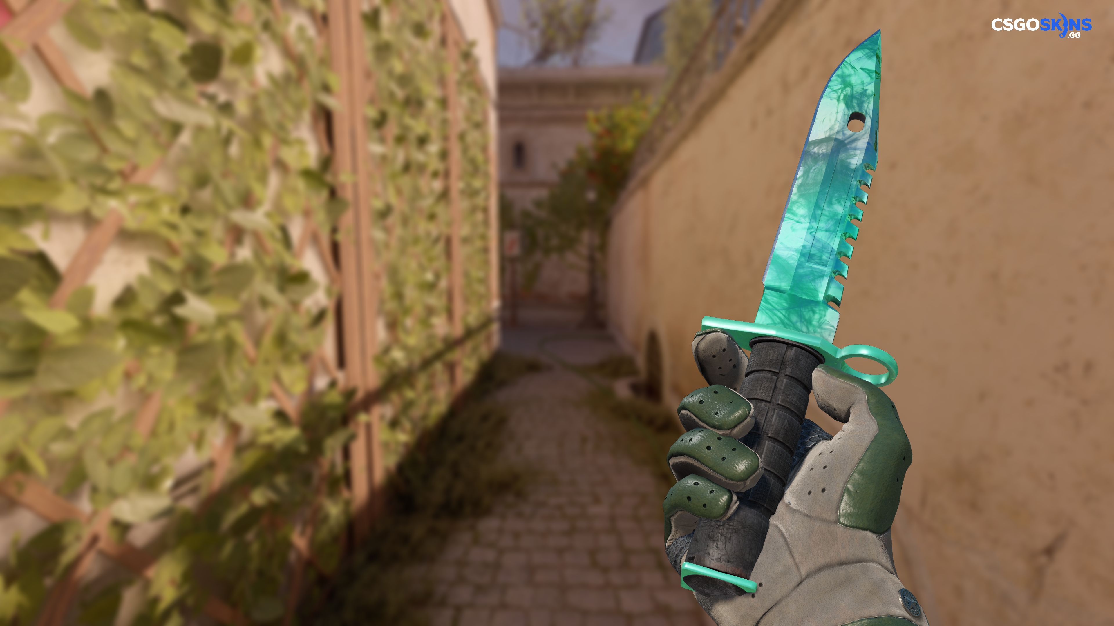 This M9 Bayonet has been painted in a "Anodized Multicolored" style, with the Gamma Doppler Phase 2 finish. In this style, the candy coat may be applied in a multicolored pattern. In the real world, methods could include silk-screening or adherable stencils. The primary color of this skin is composed of a green tint. The look of the Gamma Doppler Phase 2 finish is affected by its pattern index. The skin uses the new CS2 model.