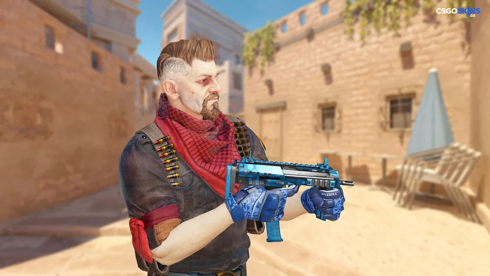Versatile but expensive, the German-made MP7 SMG is the perfect choice for high-impact close-range combat. It has been painted metallic blue and given a skull decal. Get your head out of the clouds