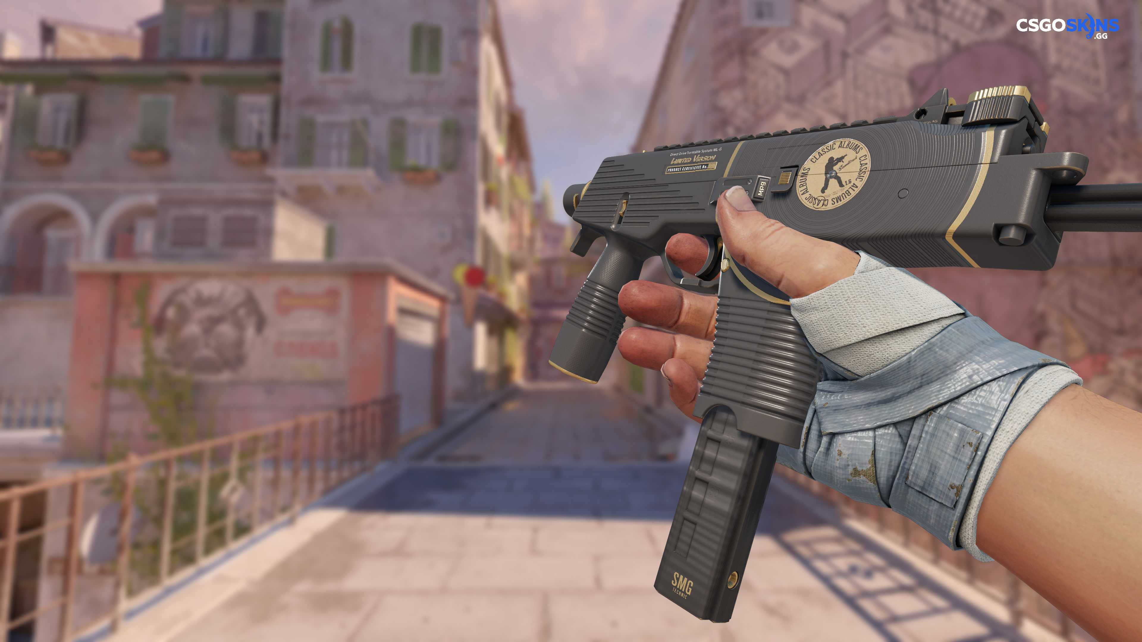 Manufactured in Switzerland, the cutting-edge MP9 SMG is an ergonomic polymer weapon favored by private security firms. It has been custom painted to resemble a vinyl record, grooves and all. Instant classic