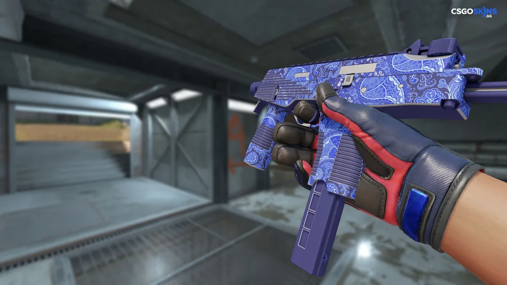 This MP9 has been painted in a "Hydrographic" style, with the Cobalt Paisley finish. Disassembled weapon parts are lowered through a floating hydrographic film on the surface of a water tank. The film adheres to the primed weapon parts, covering the surface with a pattern. The primary color of this skin is composed of a blue tint. The look of the Cobalt Paisley finish is affected by its pattern index. The skin uses the new CS2 model.