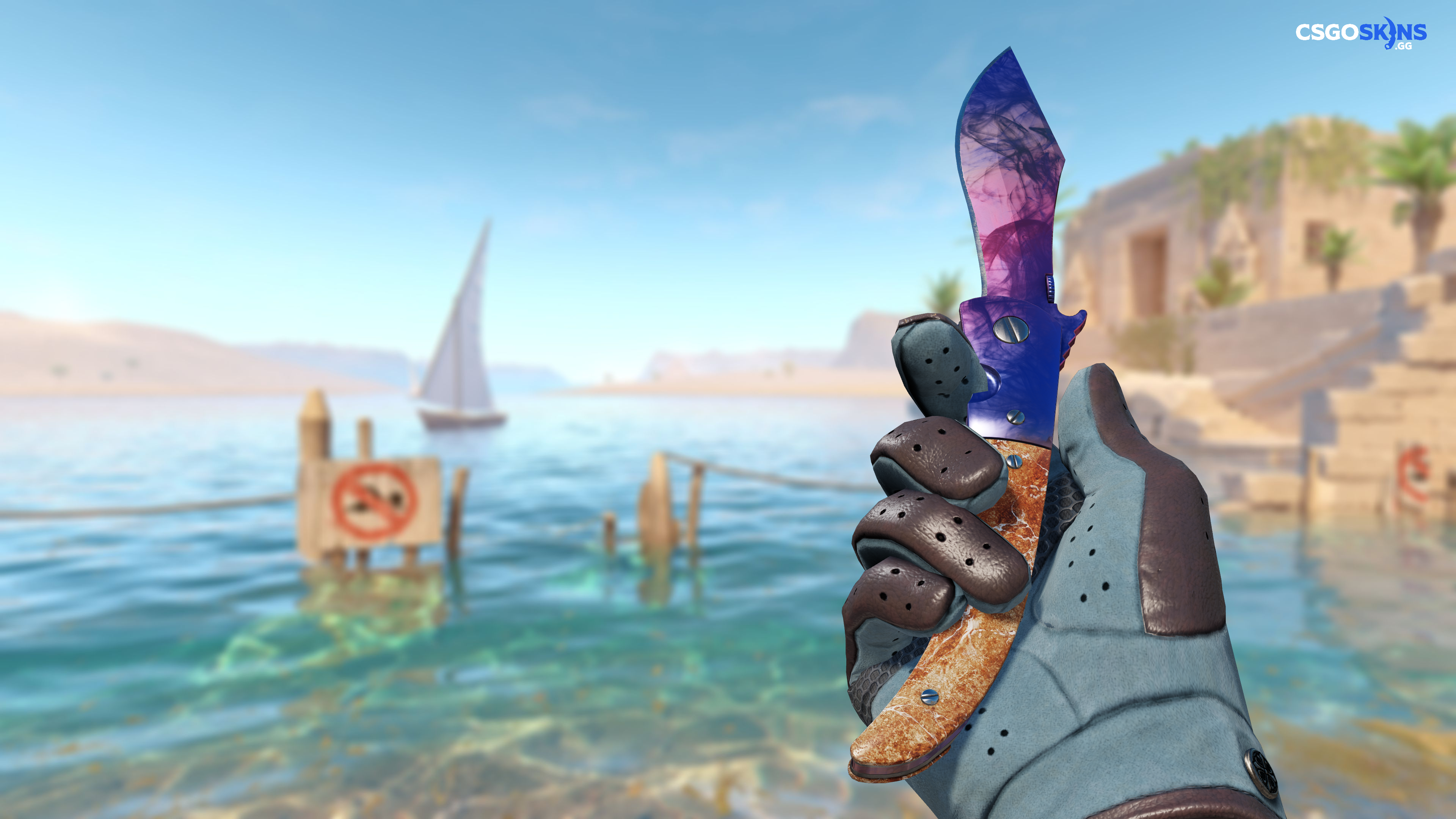 This Navaja Knife has been painted in a "Anodized Multicolored" style, with the Doppler Phase 1 finish. In this style, the candy coat may be applied in a multicolored pattern. In the real world, methods could include silk-screening or adherable stencils. The skin has been painted in a color scheme of blue and purple. The look of the Doppler Phase 1 finish is affected by its pattern index. The skin uses the new CS2 model.