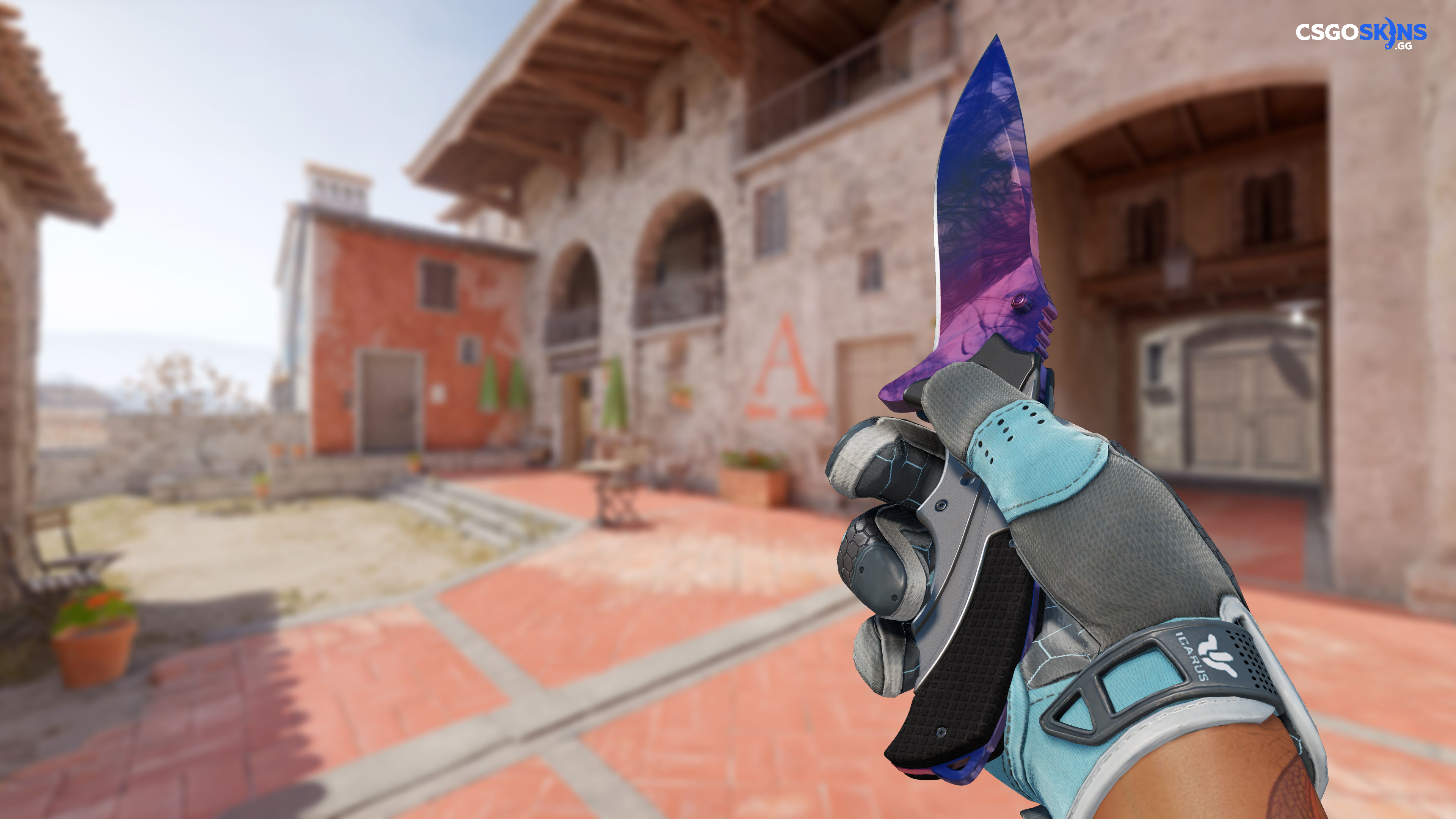 This Nomad Knife has been painted in a "Anodized Multicolored" style, with the Doppler Phase 1 finish. In this style, the candy coat may be applied in a multicolored pattern. In the real world, methods could include silk-screening or adherable stencils. The skin has been painted in a color scheme of blue and purple. The look of the Doppler Phase 1 finish is affected by its pattern index. The skin uses the new CS2 model.