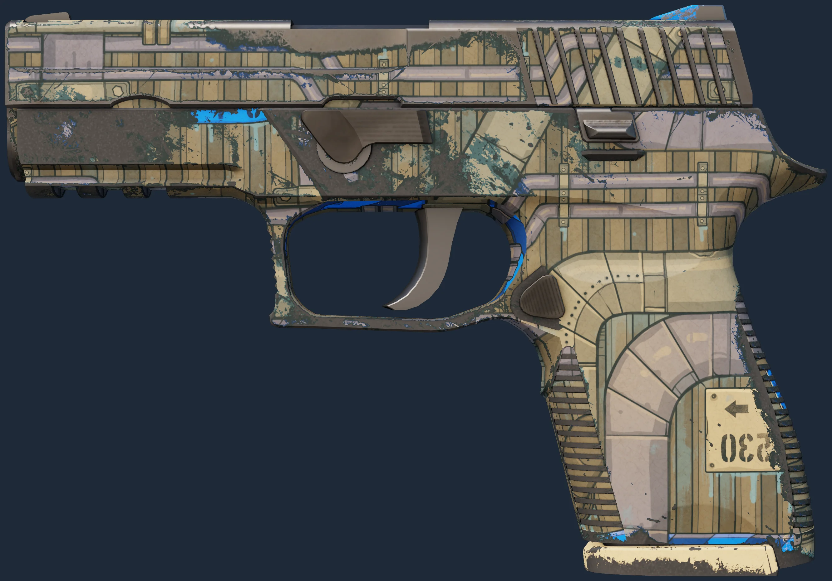 This P250 has been painted in a "Hydrographic" style, with the Exchanger finish. Disassembled weapon parts are lowered through a floating hydrographic film on the surface of a water tank. The film adheres to the primed weapon parts, covering the surface with a pattern. That said, this particular skin has been mostly painted in shades of gray. The look of the Exchanger finish is affected by its pattern index. The skin uses the old legacy model.