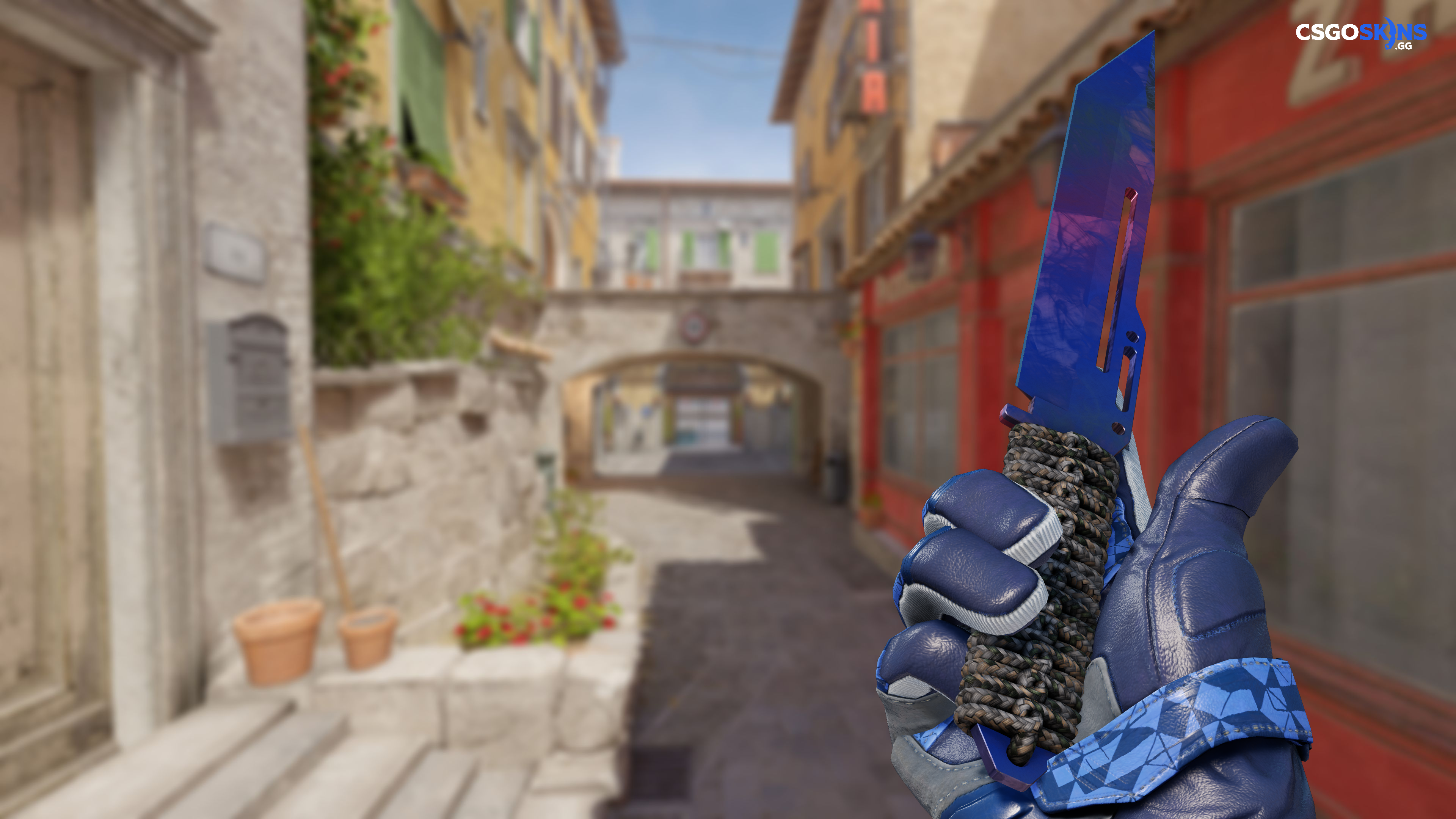 This Paracord Knife has been painted in a "Anodized Multicolored" style, with the Doppler Phase 1 finish. In this style, the candy coat may be applied in a multicolored pattern. In the real world, methods could include silk-screening or adherable stencils. The skin has been painted in a color scheme of blue and purple. The look of the Doppler Phase 1 finish is affected by its pattern index. The skin uses the new CS2 model.