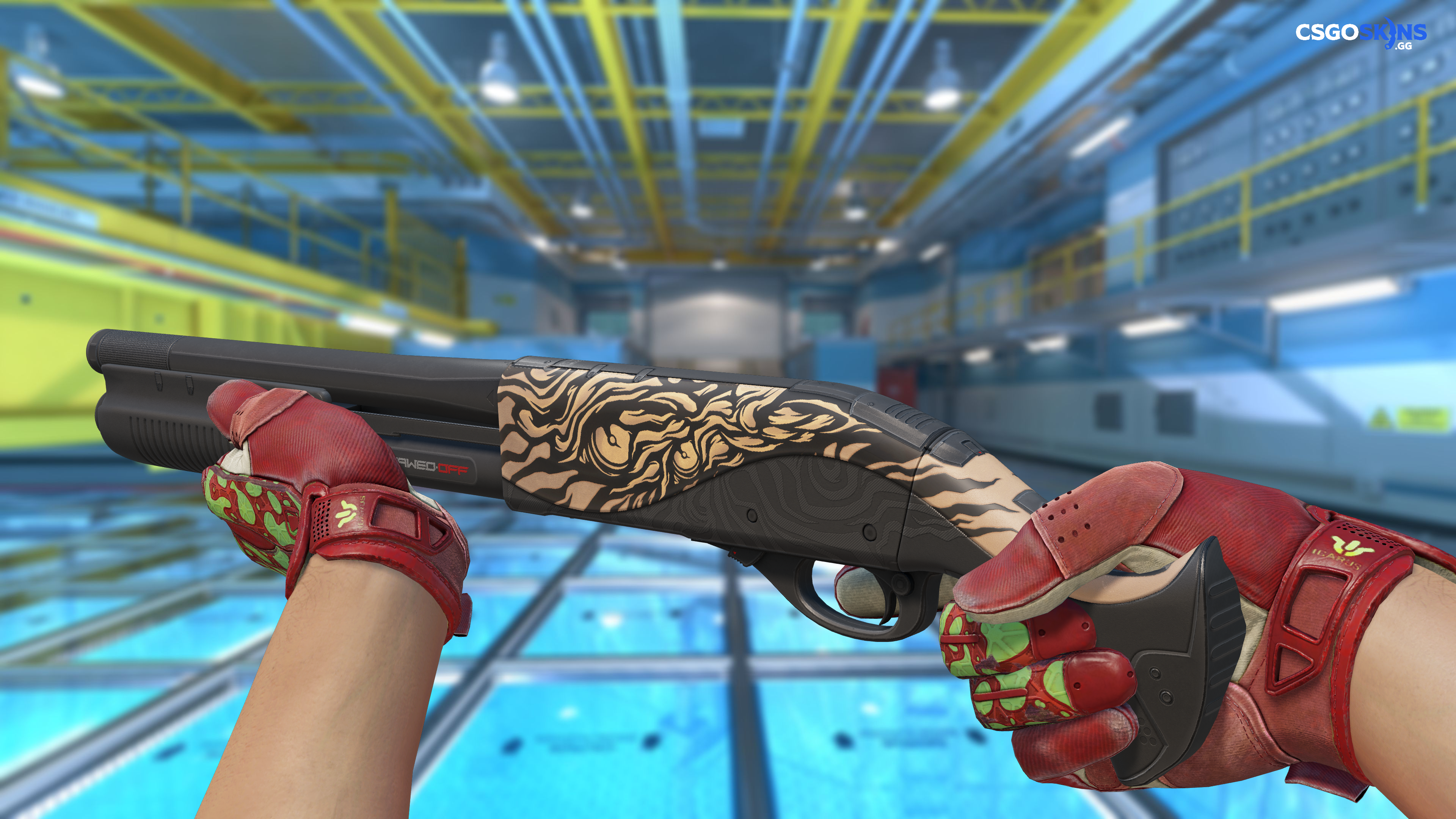 This Sawed-Off has been painted in a "Gunsmith" style, with the Fusion finish. This style uses a combination of patina and custom paint styles. The primary color of this skin is composed of a brown tint. Different pattern indexes have no effect on the Fusion finish. The skin uses the new CS2 model.