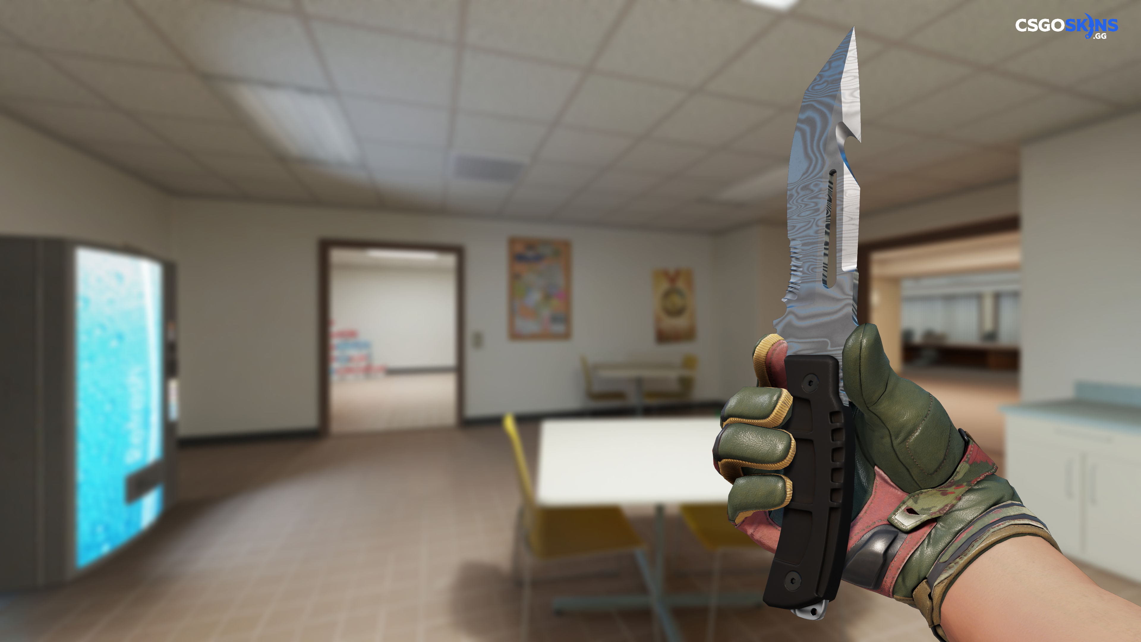 This Survival Knife has been painted in a "Patina" style, with the Damascus Steel finish. A patina is a chemical reaction that forms a non-reactive, hardened shell over metallic parts. Real-life weapon patinas include case hardening, cold bluing, and acid forced patinas. The primary color of this skin is composed of a white tint. The look of the Damascus Steel finish is affected by its pattern index. The skin uses the old legacy model.