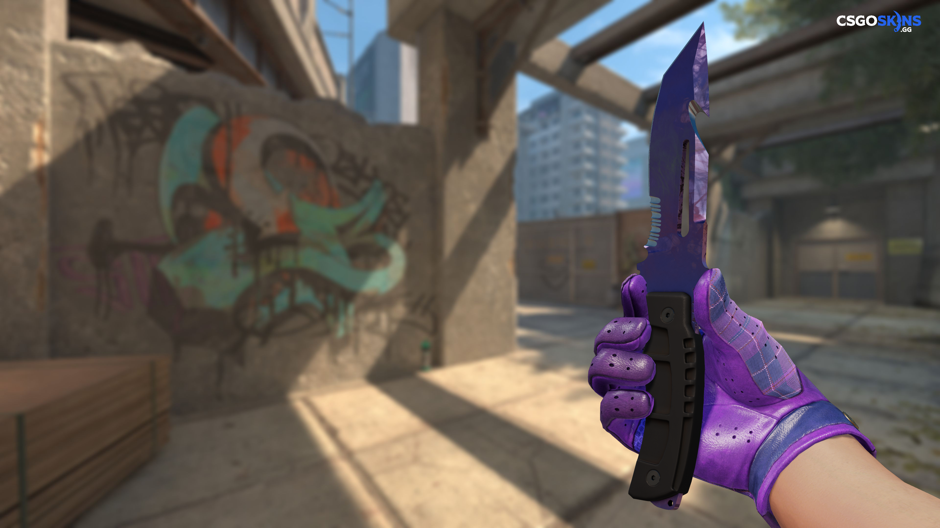 This Survival Knife has been painted in a "Anodized Multicolored" style, with the Doppler Black Pearl finish. In this style, the candy coat may be applied in a multicolored pattern. In the real world, methods could include silk-screening or adherable stencils. The primary color of this skin is composed of a purple tint. The look of the Doppler Black Pearl finish is affected by its pattern index. The skin uses the new CS2 model.