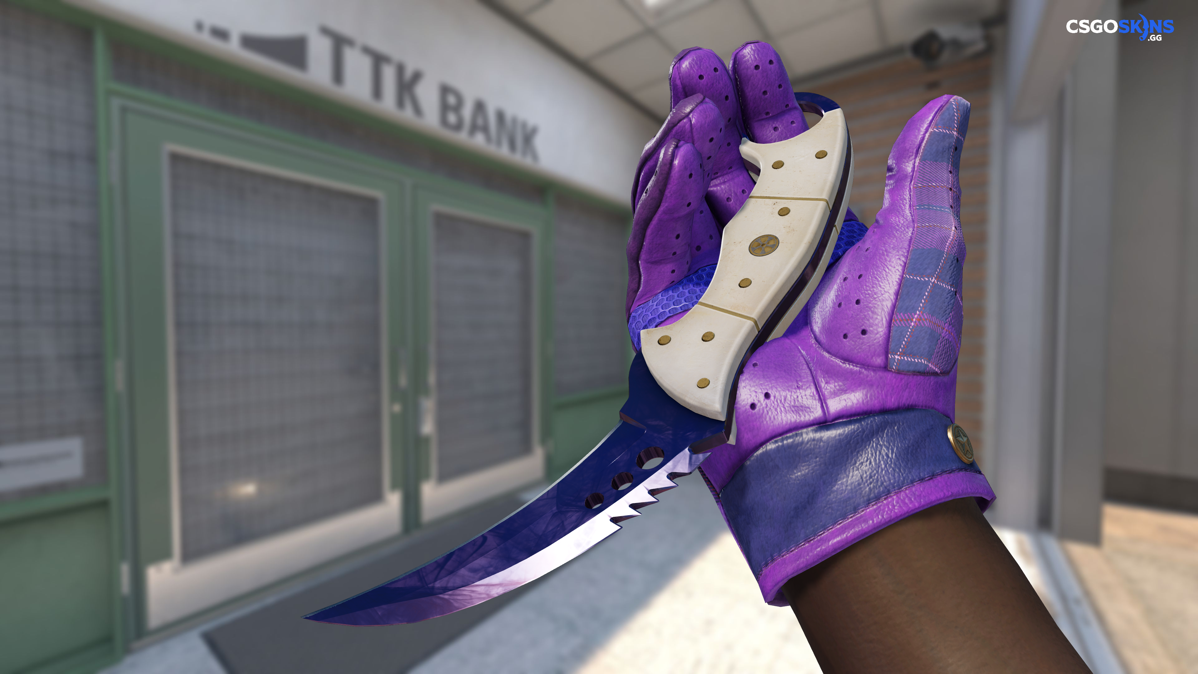This Talon Knife has been painted in a "Anodized Multicolored" style, with the Doppler Black Pearl finish. In this style, the candy coat may be applied in a multicolored pattern. In the real world, methods could include silk-screening or adherable stencils. The primary color of this skin is composed of a purple tint. The look of the Doppler Black Pearl finish is affected by its pattern index. The skin uses the new CS2 model.