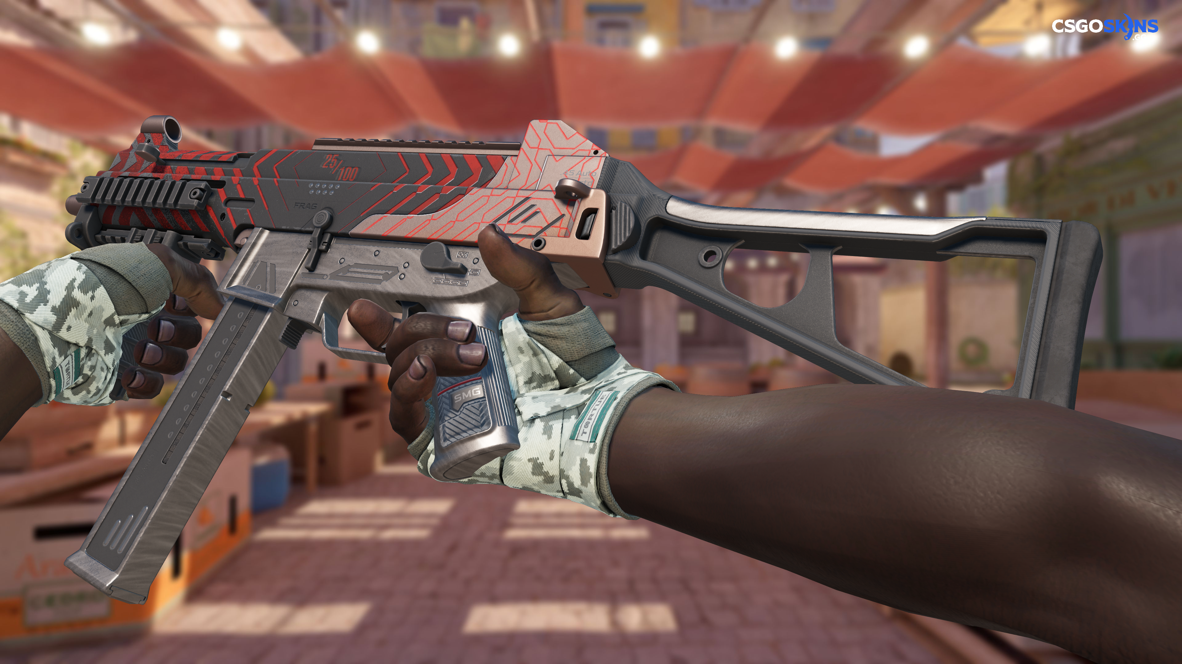 This UMP-45 has been painted in a "Gunsmith" style, with the Fragment finish. This style uses a combination of patina and custom paint styles. The primary color of this skin is composed of a red tint. Different pattern indexes have no effect on the Fragment finish. The skin uses the new CS2 model.